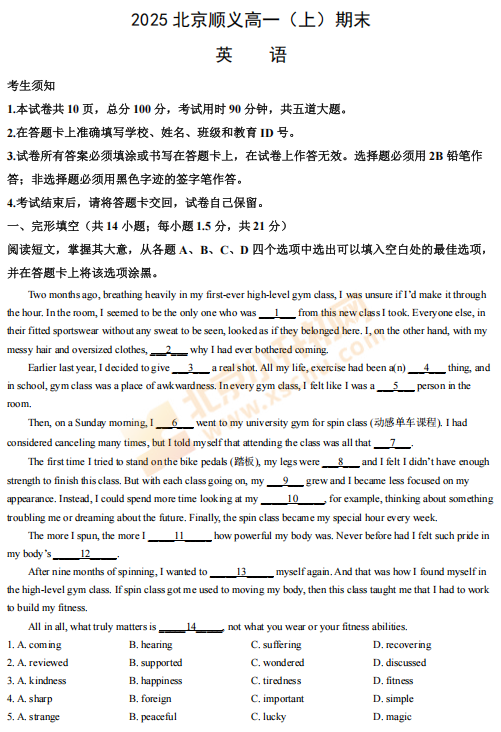 2025-2026学年(上)顺义高一期末英语试卷及答案预计在2026年1月出炉!家长可先下载去年期末试题,练习提升!新试卷公布后将更新在本页面,建议(Ctrl+D)收藏本页面!