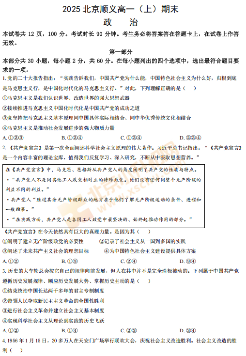 2025-2026学年第一学期顺义高一期末政治试卷及答案什么时候出?考哪些内容?如何下载?