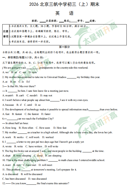 西城区2025-2026学年第一学期北京三帆中学初三期末英语试卷及答案已出!完整版试卷下载请点击文末pdf文件。