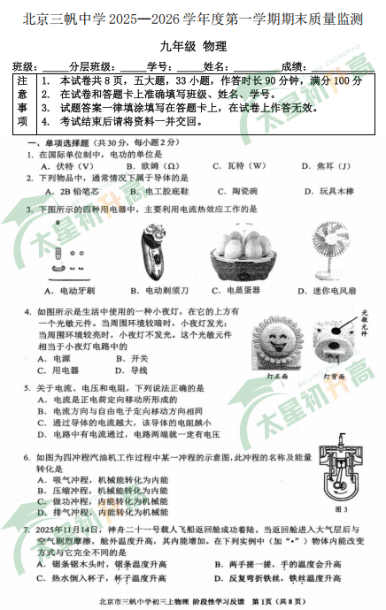 西城区2025-2026学年第一学期北京三帆中学初三期末物理试卷及答案已出!完整版试卷下载请点击文末pdf文件。