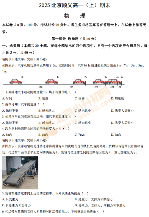 2025-2026学年(上)顺义高一期末物理试卷及答案预计在2026年1月出炉!家长可先下载去年期末试题,练习提升!新试卷公布后将更新在本页面,建议(Ctrl+D)收藏本页面!