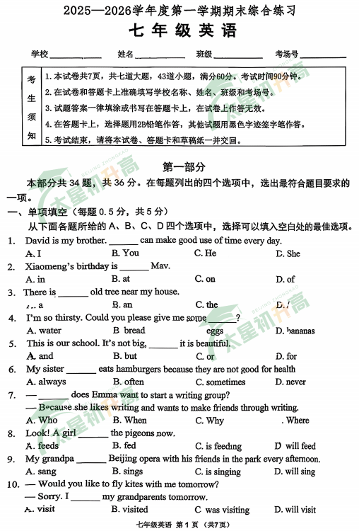2025-2026学年第一学期门头沟大峪中学初一期末英语试卷及答案什么时候出?考哪些内容?如何下载?