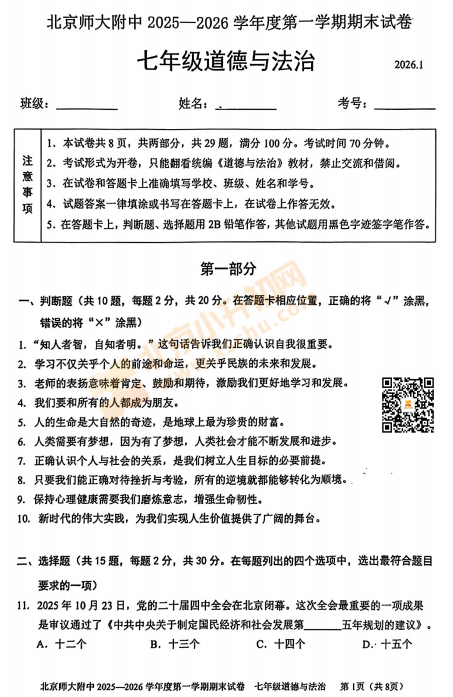 西城区2025-2026学年第一学期北京师大附中初一期末道德与法治试卷已出!下载完整版试卷请点击文末pdf文件!