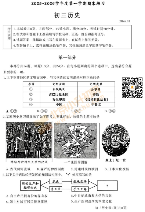 2025-2026学年第一学期大兴初三期末历史试卷及答案什么时候出?考哪些内容?如何下载?