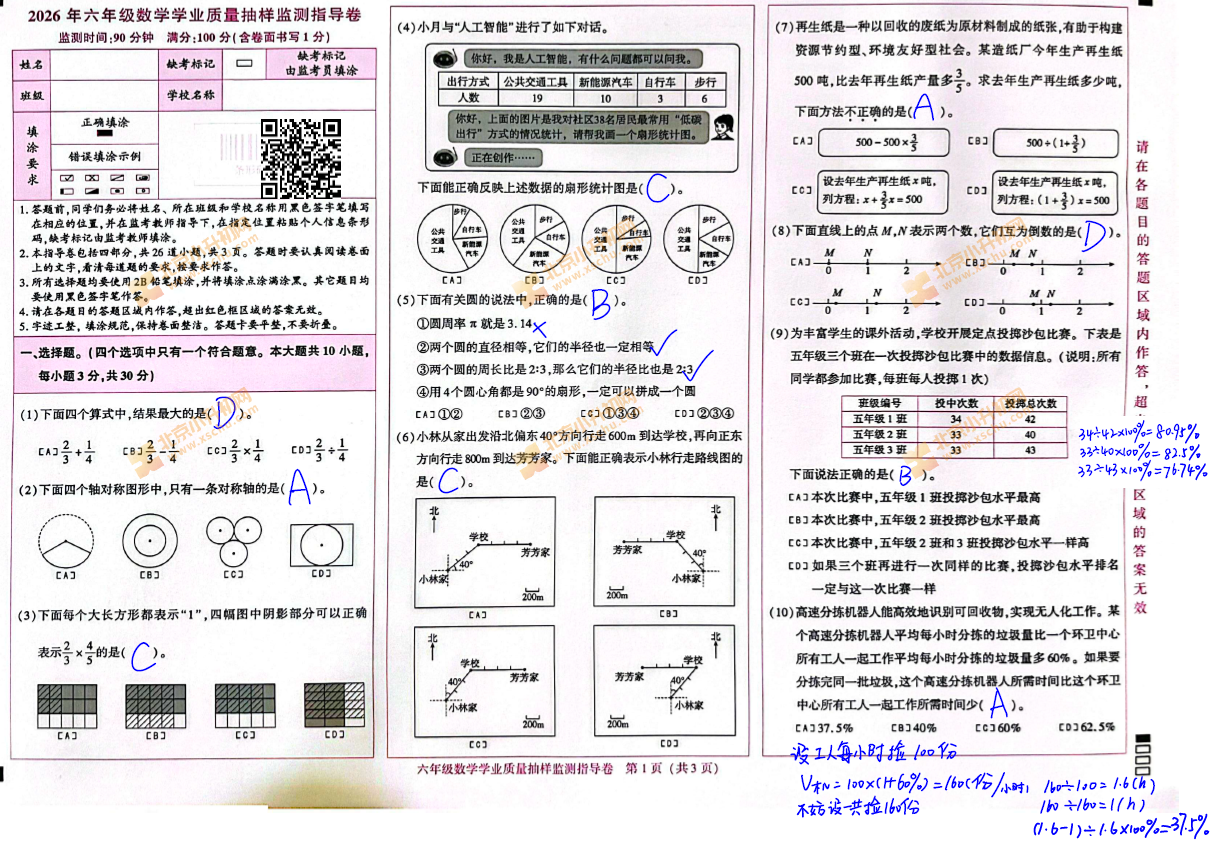 2025-2026学年第一学期朝阳区小学六年级期末数学试题答案已出,包括选择题、填空题、计算题、解答题,北京小升初网分享相关信息,供各位学生家长们查看。