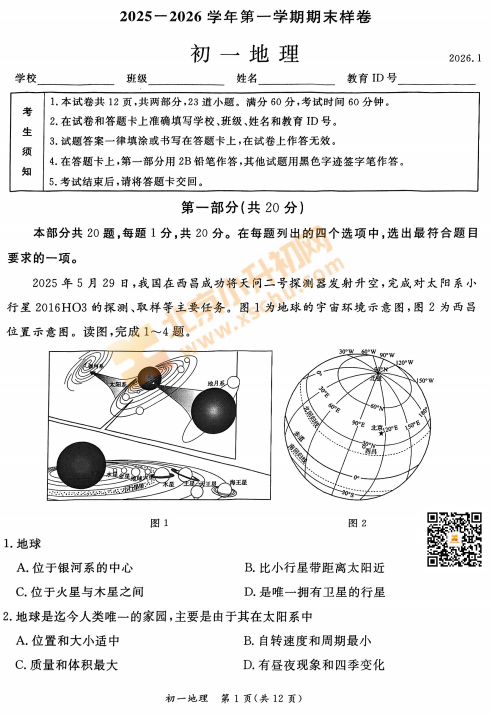 2025-2026学年(上)东城区初一期末地理试卷及答案已出炉!下载完整版试卷请点击文末pdf文件!或点击下方图片↓打包下载2026年北京各区初中期末试卷!