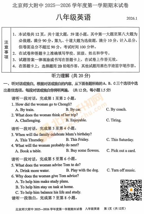 西城区2025-2026学年第一学期北京师大附中初二期末英语试卷已出!完整版试卷下载请点击文末pdf文件。
