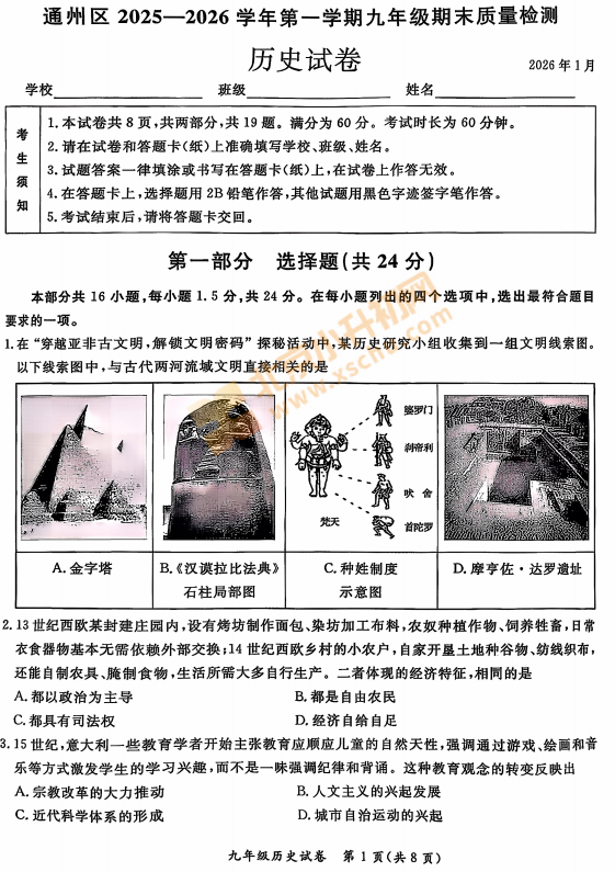 2025-2026学年第一学期通州初三期末历史试卷什么时候出?考哪些内容?如何下载?