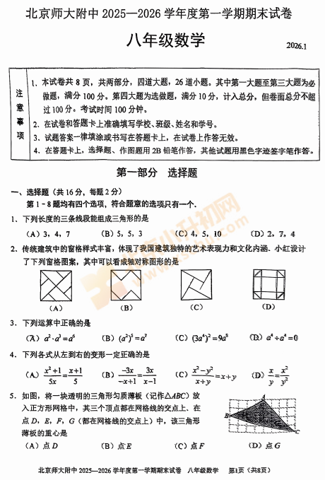 西城区2025-2026学年第一学期北京师大附中初二期末数学试卷已出!完整版试卷下载请点击文末pdf文件。