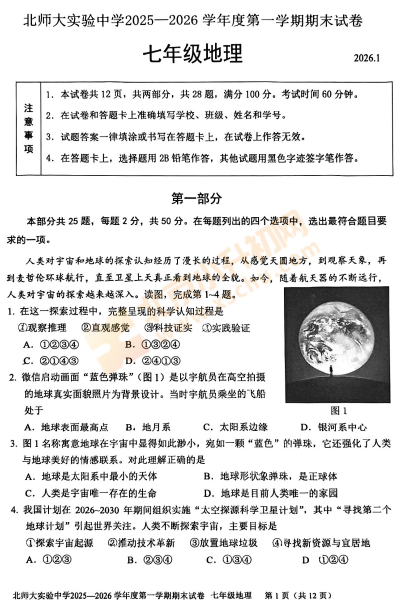 西城区2025-2026学年第一学期北师大实验中学初一期末地理试卷已出!下载完整版试卷请点击文末pdf文件!