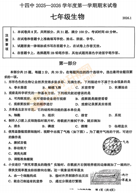 西城区2025-2026学年第一学期北京十四中初一期末生物试卷已出!完整版试卷下载请点击文末pdf文件。