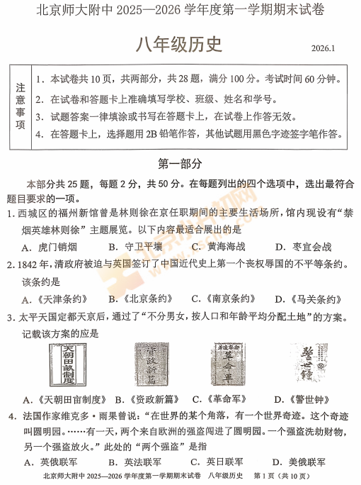 西城区2025-2026学年第一学期北京师大附中初二期末历史试卷已出!下载完整版试卷请点击文末pdf文件!