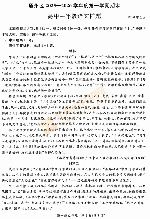 2025-2026学年(上)通州高一期末语文试卷已出炉!下载完整版试卷请点击文末pdf文件!或点击下方图片↓打包下载2026年北京各区高中期末试卷!