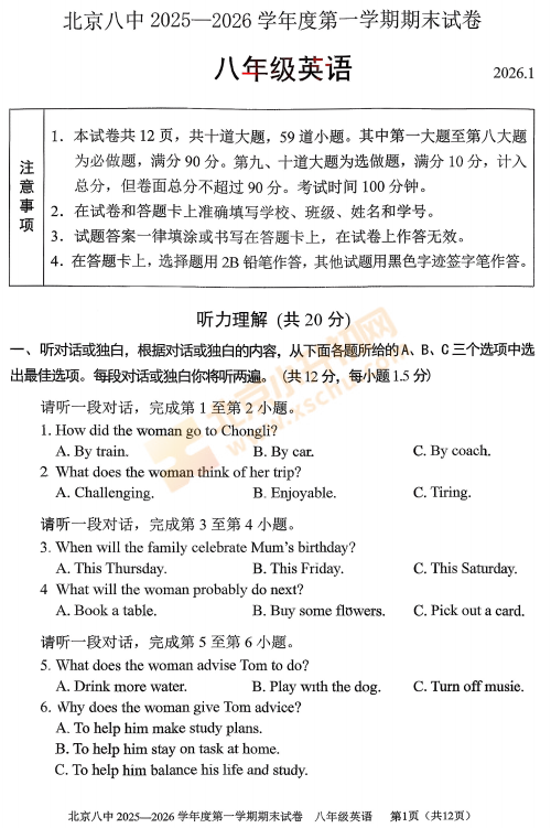 西城区2025-2026学年第一学期北京八中初二期末英语试卷已出!下载完整版试卷请点击文末pdf文件!