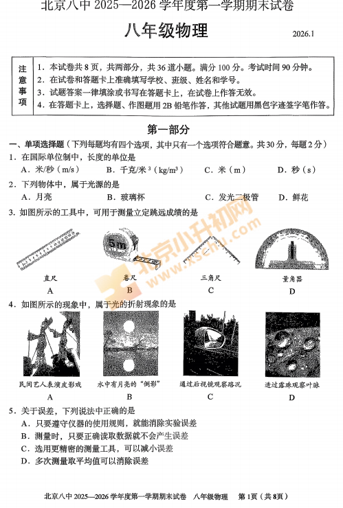 西城区2025-2026学年第一学期北京八中初二期末物理试卷已出!完整版试卷下载请点击文末pdf文件。