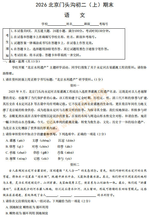 2025-2026学年(上)门头沟初二期末语文试卷及答案已出炉!下载完整版试卷请点击文末pdf文件!或点击下方图片↓打包下载2026年北京各区初中期末试卷!
