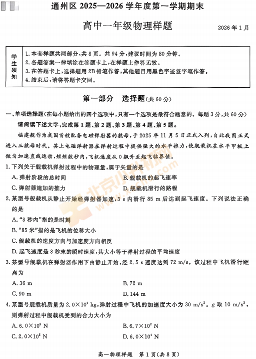 2025-2026学年第一学期通州高一期末物理试卷及答案什么时候出?考哪些内容?如何下载?