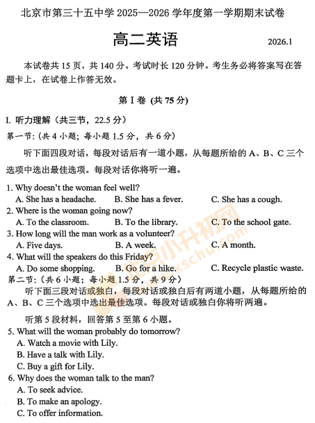 西城区2025-2026学年第一学期北京三十五中高二期末英语试卷已出!完整版试卷下载请点击文末pdf文件。