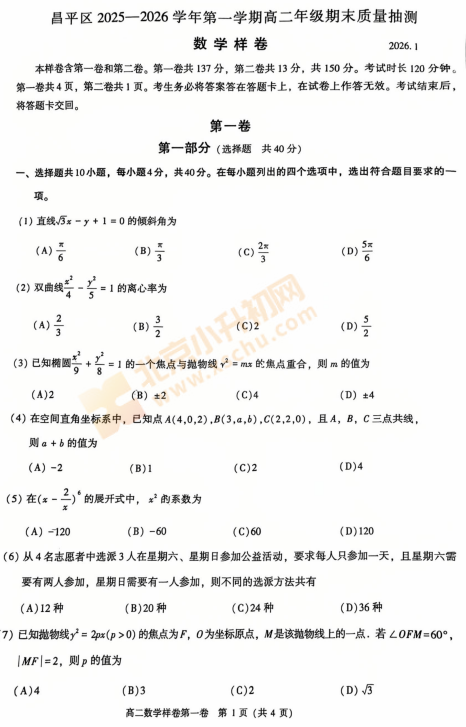 2025-2026学年第一学期昌平高二期末数学试卷及答案什么时候出?考哪些内容?如何下载?