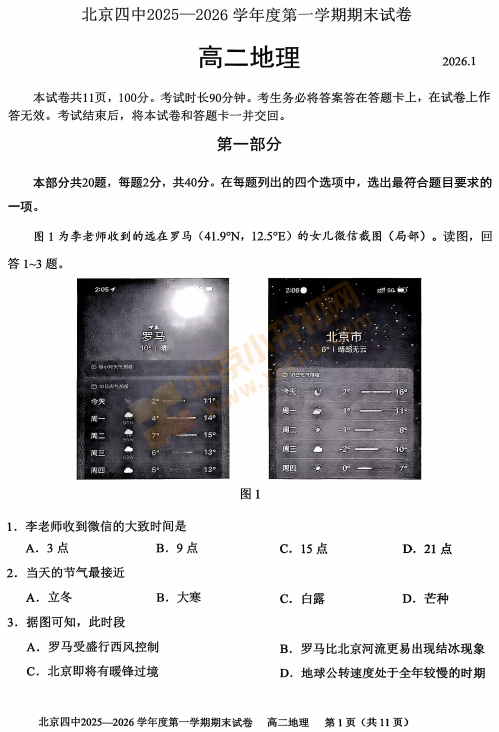 2025-2026学年第一学期北京四中高二期末地理试卷什么时候出?考哪些内容?如何下载?