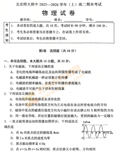 2025-2026学年(上)北京师大附中高二期末物理试卷已出炉!下载完整版试卷请点击文末pdf文件!或点击下方图片↓打包下载2026年北京各区高中期末试卷!