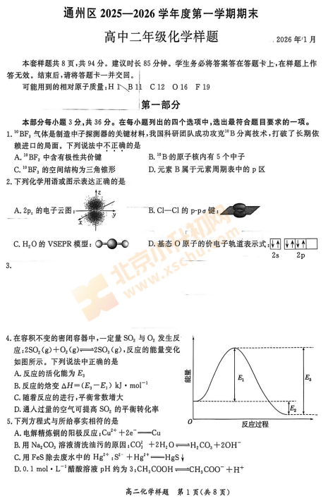 2025-2026学年(上)通州高二期末化学试卷已出炉!下载完整版试卷请点击文末pdf文件!或点击下方图片↓打包下载2026年北京各区高中期末试卷!