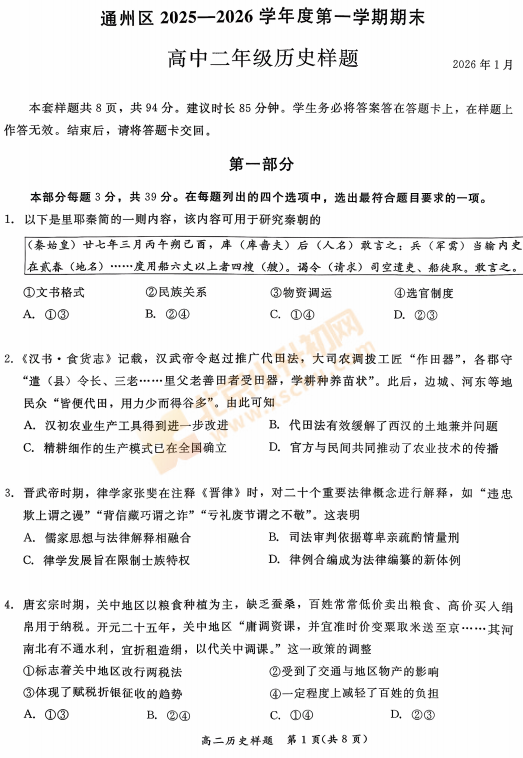 2026北京通州高二(上)期末历史