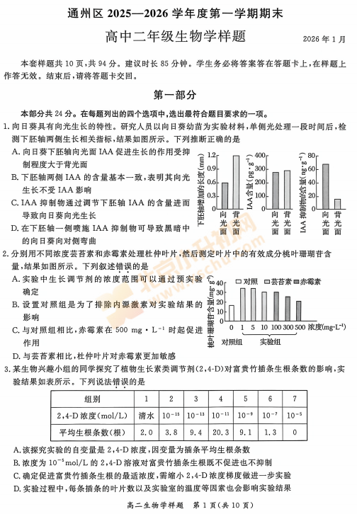 2025-2026学年第一学期通州高二期末生物试卷及答案什么时候出?考哪些内容?如何下载?
