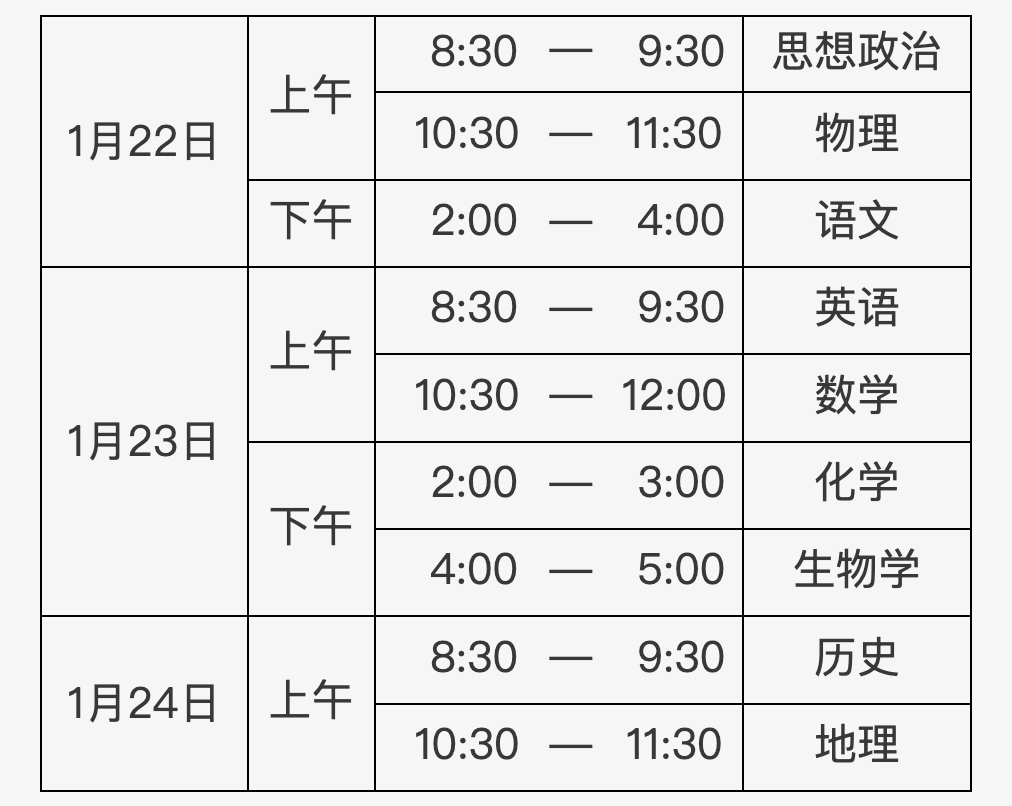考试科目包括语文、数学、外语、思想政治、历史、地理、物理、化学、生物学,各科满分均为100分。考试成绩将于2月中旬发布。