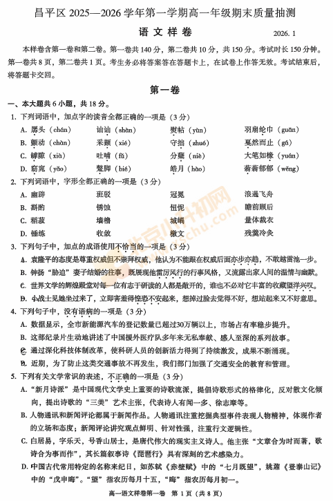 2025-2026学年(上)昌平高一期末语文试卷已出炉!下载完整版试卷请点击文末pdf文件!或点击下方图片↓打包下载2026年北京各区高中期末试卷!