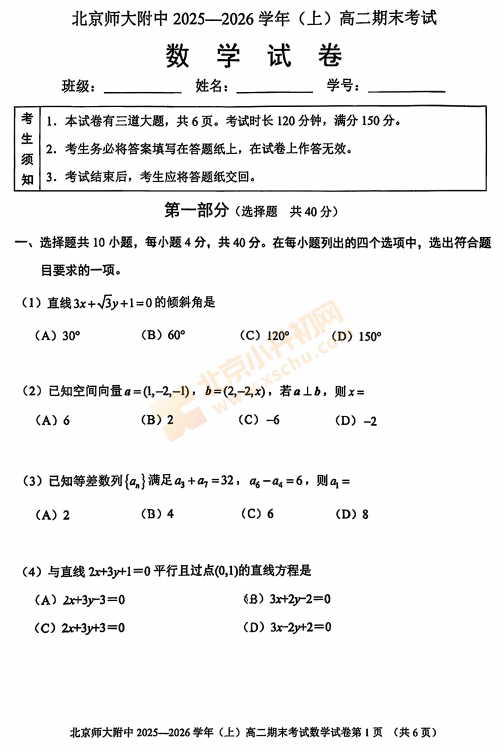 2025-2026学年第一学期北京师大附中高二期末数学试卷什么时候出?考哪些内容?如何下载?