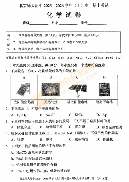 2025-2026学年第一学期北京师大附中高一期末化学试卷什么时候出?考哪些内容?如何下载?