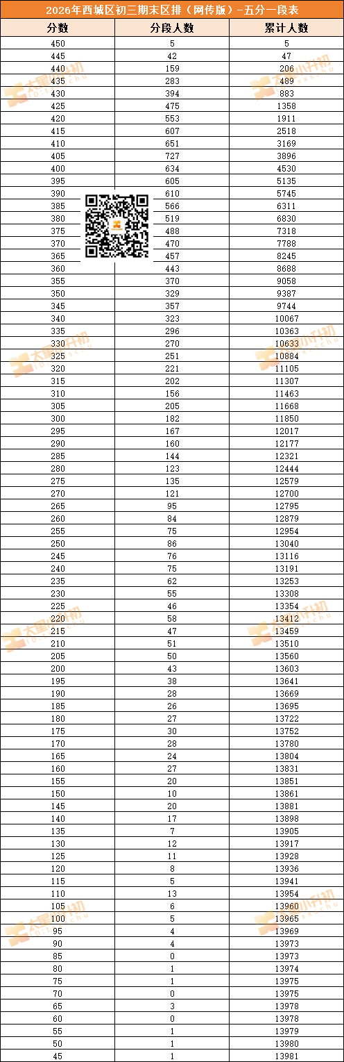北京小升初网根据家长分享整理:2026西城区初三上学期期末成绩区排、五分一段表!