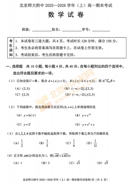 2025-2026学年第一学期北京师大附中高一期末数学试卷及答案什么时候出?考哪些内容?如何下载?