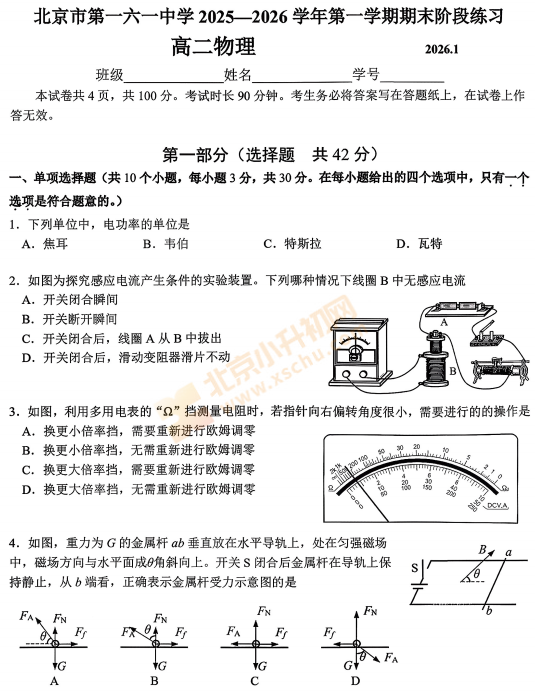 2026西城高中期末试卷北京一六一中学高二期末物理试卷