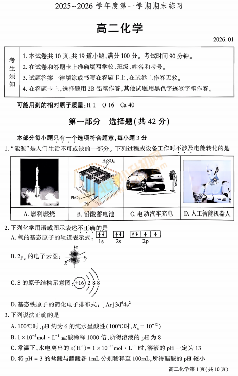 2025-2026学年(上)北京大兴一中高二期末化学试卷及答案已出炉!下载完整版试卷请点击文末pdf文件!或点击下方图片↓打包下载2026年北京各区高中期末试卷!