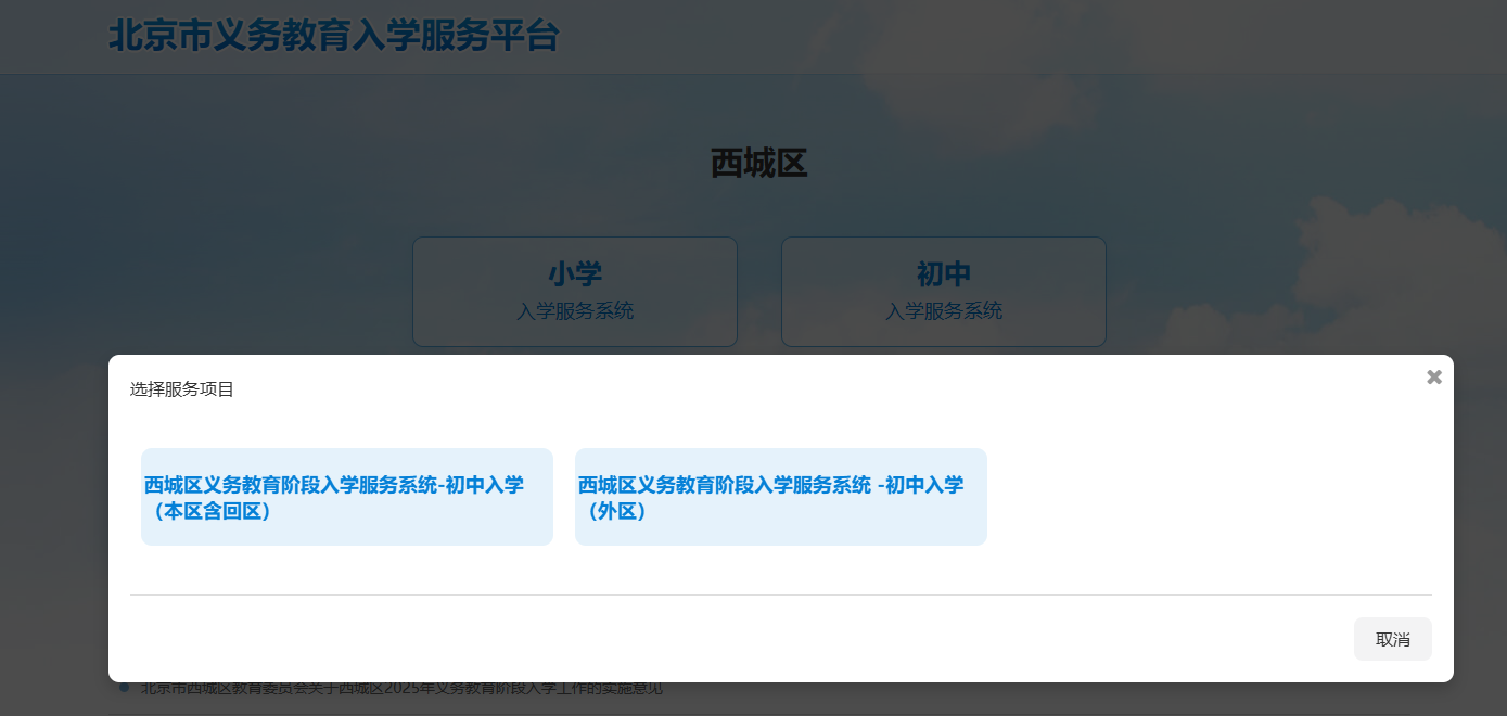 三、点击“初中入学服务系统”,选择本区或外区(如下图)