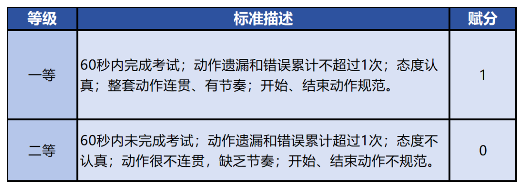 根据考生完成动作时的整体表现判定考生动作表现的等级,并按相应等级对应的分值赋分。一等赋1分、二等赋0分。
