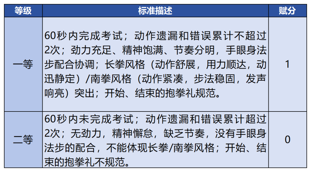根据考生完成动作时的整体表现判定考生演练水平的等级,并按相应等级对应的分值赋分。一等赋1分、二等赋0分。