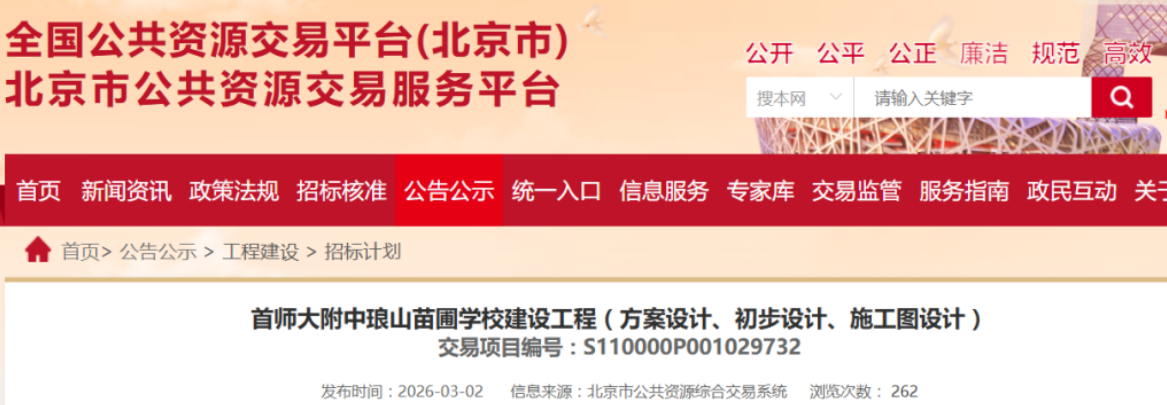 目前项目已进入勘察设计招标阶段,各项前期工作稳步推进。新校建成后,将由首师大附中集团化办学,输出管理、师资与课程体系,进一步完善苹果园片区教育配套,为京西学子提供更多优质公办学位。