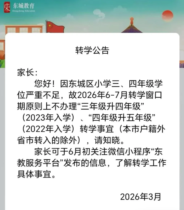 因东城区小学三、四年级学位严重不足,故2026年6-7月转学窗口期原则上不办理“三年级升四年级”(2023年入学)、“四年级升五年级”(2022年入学)转学事宜(本市户籍外省市转入的除外)。