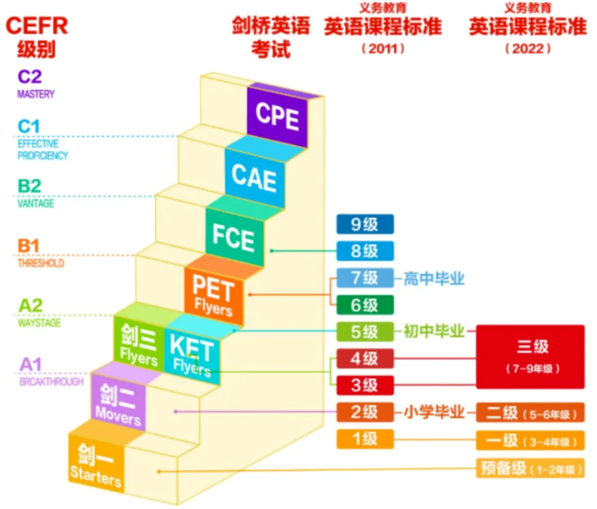 KET建议小学3-6年级考,PET建议小学高年级及初中年级考,剑桥五级对应年级详情如下图: