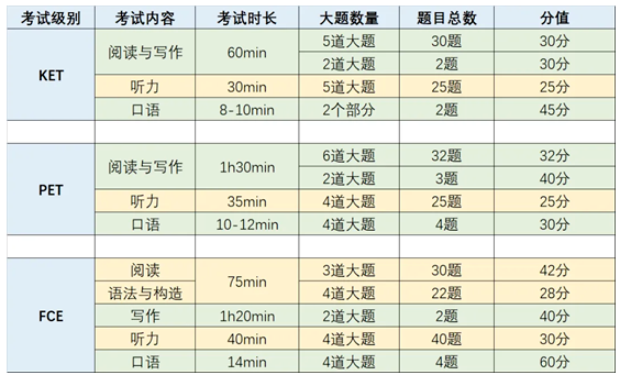剑桥通用英语有5个级别:KET、PET、FCE、CAE、CPE。KET/PET/FCE是前三个等级考试,全面检测学生的听、说、读、写能力,与雅思、托福等出国标准化考试无缝对接,通过考试可以让学生在日常生活中用英语交流,为学生参加雅思、托福考试提前做好全方位的准备以及奠定稳固的基础。