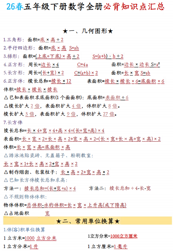 小学五年级下册数学必背公式汇总下载!涵盖几何图形、常用单位换算、运算定律、因数和倍数等,部分内容展示如下: