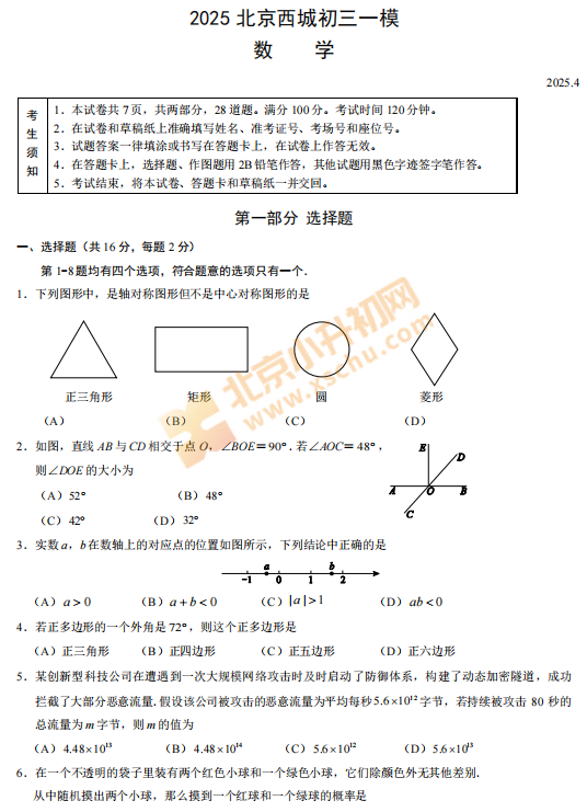 2026西城初三一模考试预计在4月中下旬进行,北京各区初三考生可下载2025年西城初三一模数学试卷复习,2026最新试卷发布后将更新在本页面,建议收藏!