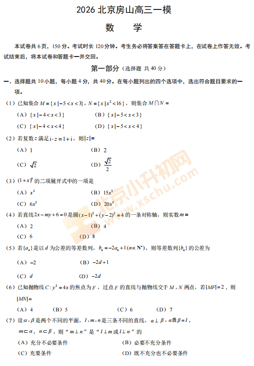 2026房山高三一模数学试卷已出!考哪些内容?满分多少?有多少题?2026、2027、2028房山高三考生下载复习!