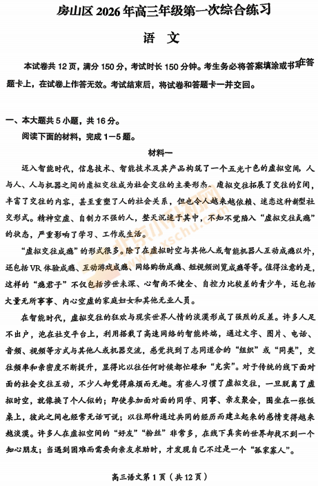 2026房山高三一模语文试卷已出!考哪些内容?满分多少?有多少题?2026、2027、2028房山高三考生下载复习!