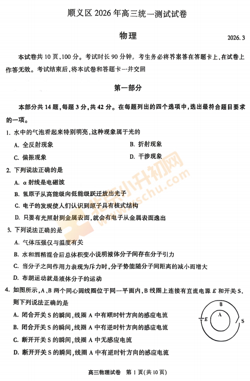 2026顺义高三一模物理试卷已出!考哪些内容?满分多少?有多少题?2026、2027、2028顺义高三考生下载复习!