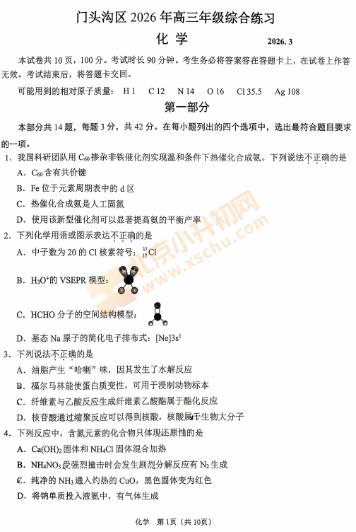 2026门头沟高三一模化学试卷已出!考哪些内容?满分多少?有多少题?2026、2027、2028门头沟高三考生下载复习!