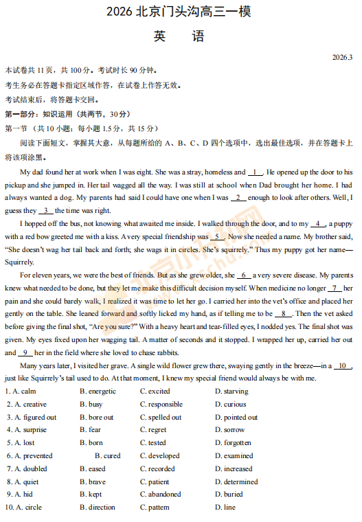 2026门头沟高三一模英语试卷已出!考哪些内容?满分多少?有多少题?2026、2027、2028门头沟高三考生下载复习!